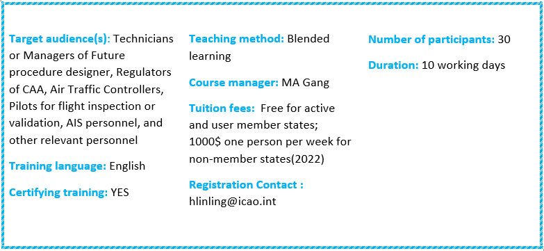 At APAC FPP, according to ICAO doc 9906 volume 2, the initial training of IFR procedures designer consists of three main modules. Each module is independent but completing each other, trainees can choose module on demand. This module is considered the first step in a comprehensive training program to design IFR procedure.