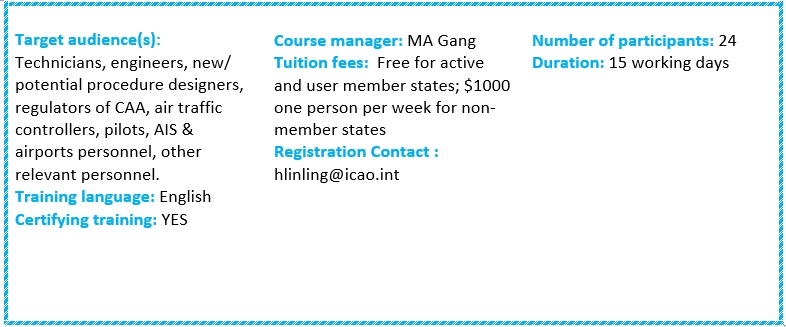 At APAC FPP, according to ICAO Doc 9906 Volume 2, the initial training of IFR procedures designers consists of two main parts, PANS-OPS PD initial course and PBN PD course. Each part is independent; trainees can choose courses according to demands. This course is considered as the second step in a comprehensive training program to design IFR procedure.