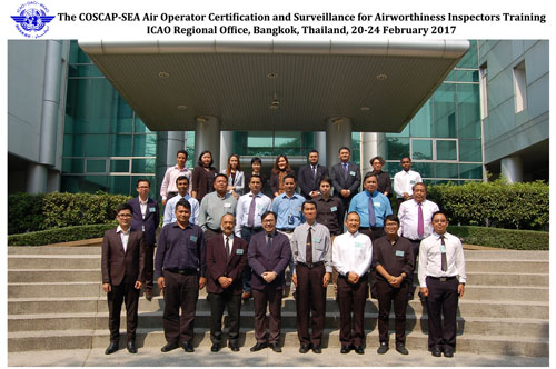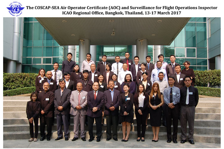 ICAO COSCAP SEA - AIR OPERATOR CERTIFICATION AND SURVEILLANCE SEMINAR FOR AIRWORTHINESS INSPECTORS (20-24 FEBRUARY 2017, BANGKOK, THAILAND) ICAO COSCAP-SEA project and Civil Aviation Authority of Singapore presented the 2017 Training Programme for Government Safety Inspectors with four courses in the initial phase of the training programme. The second course "Air Operator Certification and Surveillance Seminar for Airworthiness Inspectors" was held at the ICAO APAC Regional Office in Bangkok, Thailand from 20 to 24 February 2017. The course was attended by 23 participants from 9 States/ Administrations. The training covered the guidelines and knowledge needed for certificating maintenance organizations and air operators using relevant ICAO Manuals and SARPs. The course was conducted by Mr. Michael Pang (Head of School of Aviation Safety and Security, Singapore Aviation Academy). All documents are available at: a href="/APAC/Meetings/Pages/2017-AOC-SAI.aspx">http://www.icao.int/APAC/Meetings/Pages/2017-AOC-SAI.aspx