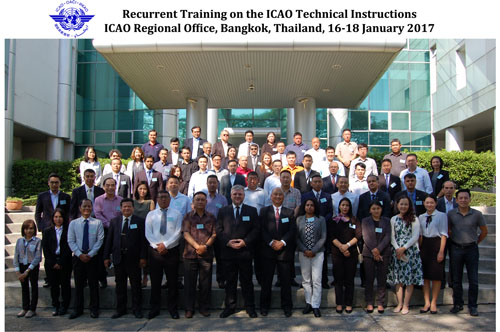 ICAO COSCAPS - DANGEROUS GOODS RECURRENT TRAINING ON ICAO TECHNICAL INSTRUCTIONS (16-18 JANUARY 2017, BANGKOK, THAILAND) COSCAP-NA, COSCAP-SA and COSCAP-SEA presented the Dangerous Goods Recurrent Training on ICAO Technical Instructions at the ICAO APAC Regional Office in Bangkok, Thailand from 16 to 18 January 2017. The course was attended by 63 participants from 13 States/ Administrations. The training covered the essential segments and the recent changes of the current edition of "ICAO Technical Instructions for the Safe Transport of Dangerous Goods by Air" as well as exercises in the acceptance and handling of dangerous goods. The course was conducted by Mr. Daniel J. Sylvestre (Dangerous Goods Inspector from Transport Canada). All documents are available at: http://www.icao.int/APAC/Meetings/Pages/2017-DGR-COSCAPs-VT-.aspx