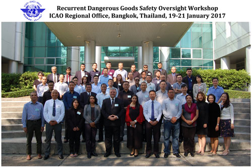 ICAO COSCAPS - RECURRENT DANGEROUS GOODS SAFETY OVERSIGHT WORKSHOP (19-21 JANUARY 2017, BANGKOK, THAILAND) COSCAP-NA, COSCAP-SA and COSCAP-SEA presented the Recurrent Dangerous Goods Safety Oversight Workshop at the ICAO APAC Regional Office in Bangkok, Thailand from 19 to 21 January 2017. The course was attended by 55 participants from 12 States/Administrations. The training provided updates on the tools and best practices for the improvement of National Dangerous Goods Safety Oversight program in order to comply with the latest the requirements established in the Annex 18 of the ICAO Convention on International Civil Aviation. The course was conducted by Mr. Daniel J. Sylvestre (Dangerous Goods Inspector from Transport Canada). All documents are available at: http://www.icao.int/APAC/Meetings/Pages/2017-DGR-COSCAPs-VT-.aspx