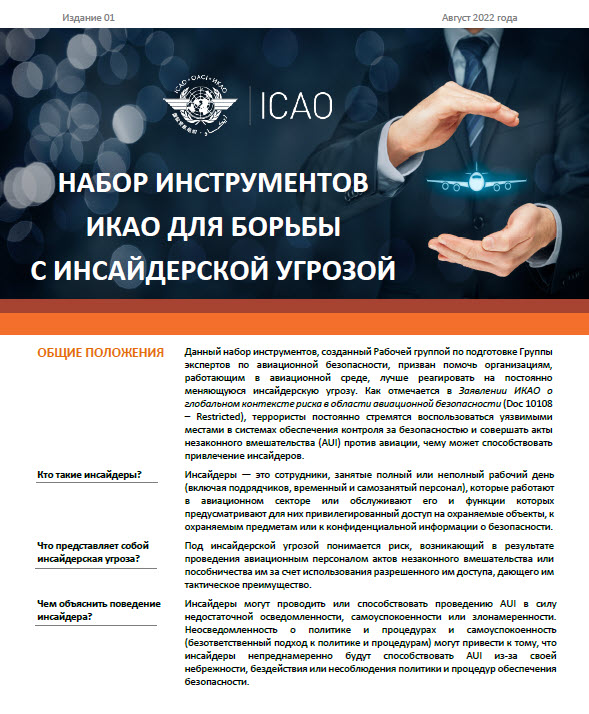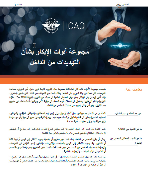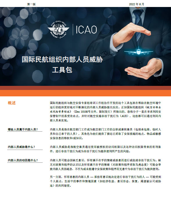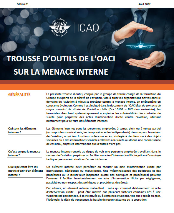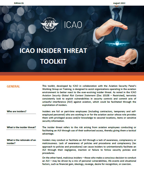 In conjunction with the ICAO Aviation Security (AVSEC) Panel's Working Group on Training, ICAO has produced an ICAO Insider Threat Toolkit, to assist organizations operating in the aviation environment to better react to the ever-evolving insider threat.
