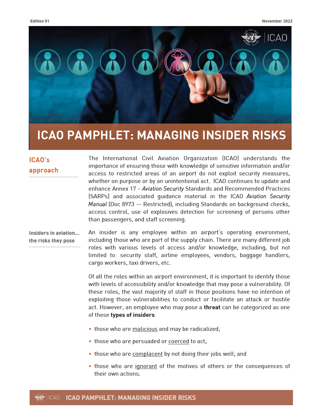 In conjunction with the ICAO Aviation Security (AVSEC) Panel's Working Group on Training, ICAO has produced a pamphlet on the risks posed by insiders. The pamphlet is designed to support the roll-out of the new ICAO Insider Risk Workshop in 2023.