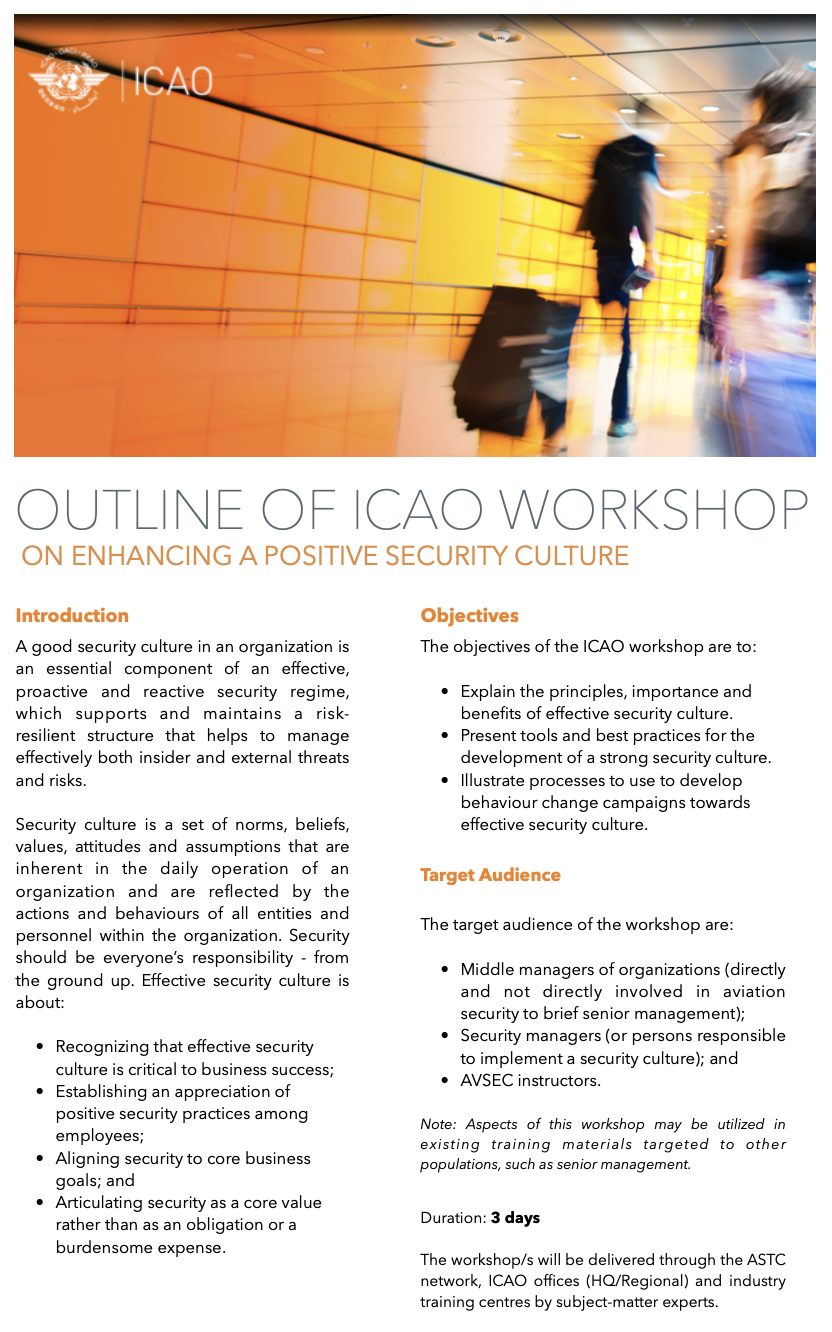 ![]() | Additionally, ICAO is proud to introduce the ICAO Security Culture Workshop, which builds upon best practices to develop, implement, and sustain security culture principles. These best practices are highlighted in the ICAO Security Culture Toolkit and the ICAO Security Culture Campaign Starter Pack. |