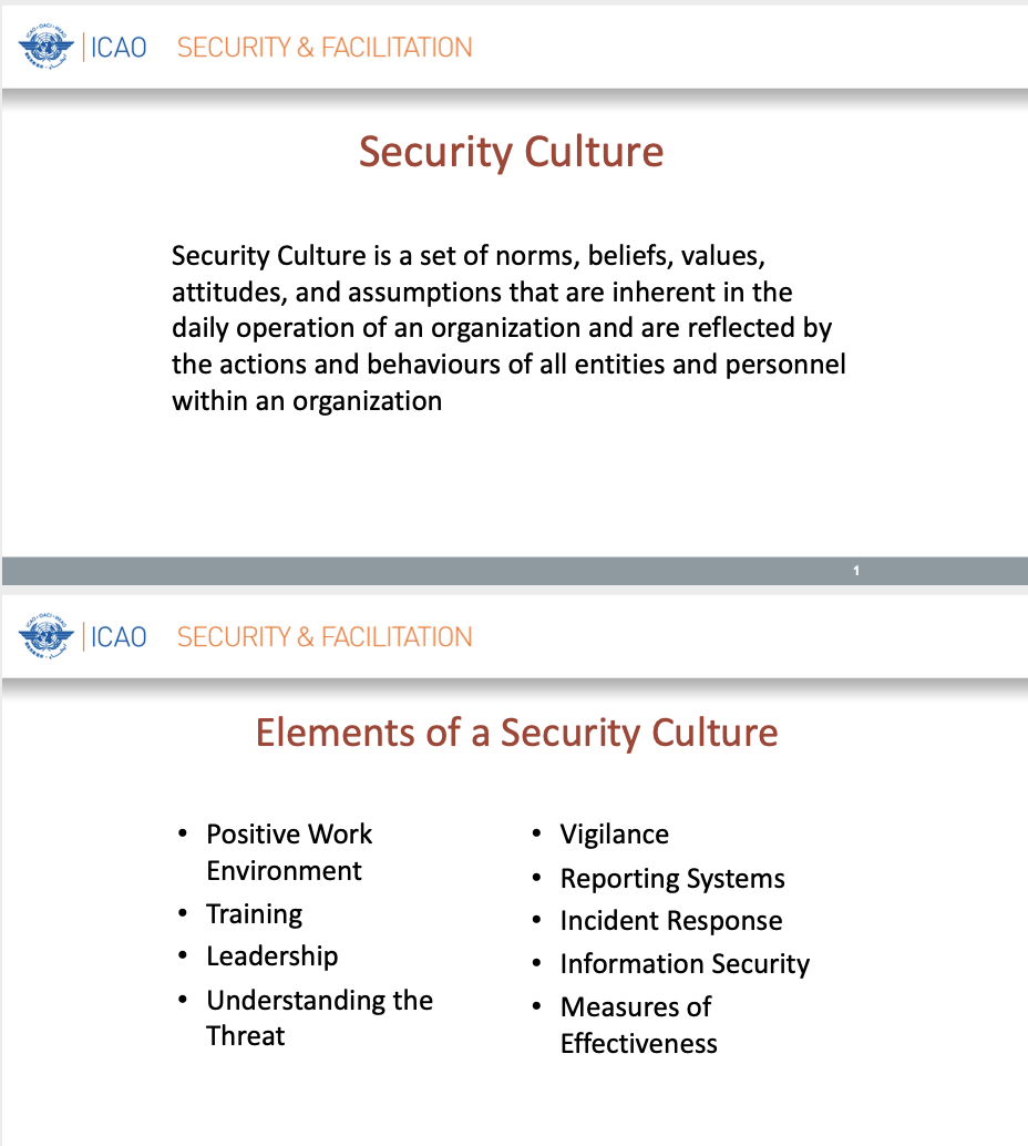 For ICAO, the promotion of a positive security culture is a priority. Indeed, a strong security culture in aviation complements any and all aviation security training that we, or any other organization, deliver, and improves the effectiveness of the measures implemented. Unless all staff within an organization are dedicated to ensuring the highest level of security and are fully aware of existing and potential threats to civil aviation, the efficacy of these measures will be greatly impacted. For this reason, all of ICAO’s aviation security training includes security culture best practices.