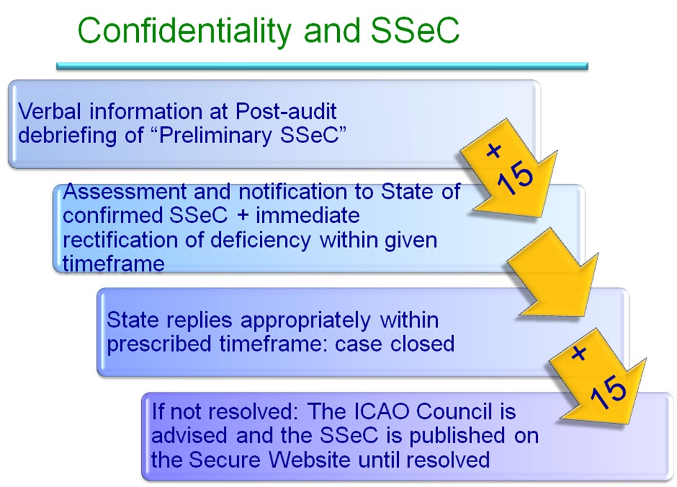 In addition to the measures which allow limited transparency of audit results, the ICAO Council approved in February 2010 a definition and a mechanism to deal with Significant Security Concerns (SSeCs) in a timely manner, outside of the established timeline for the production of audit reports and CAPs.