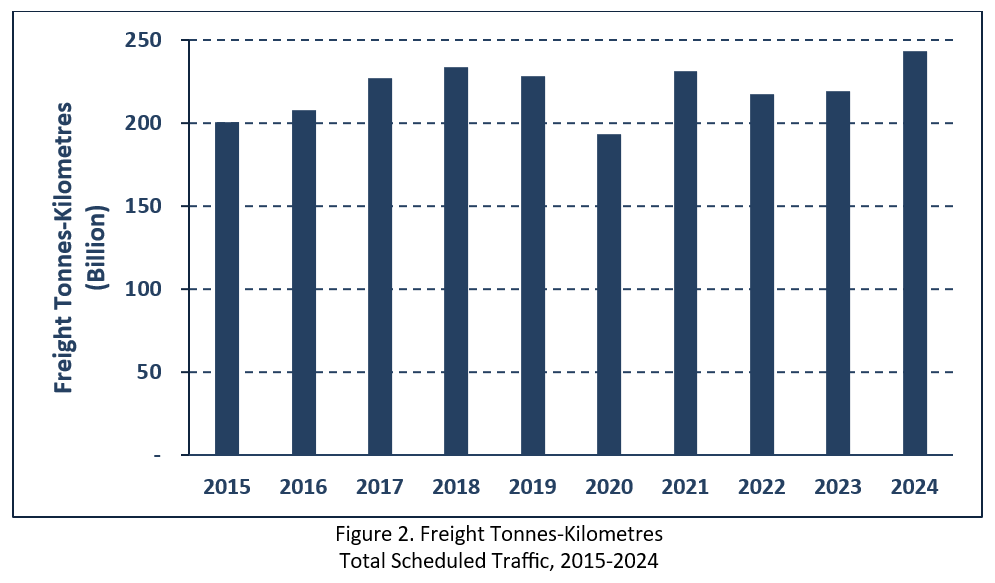 Scheduled international freight capacity in 2024, expressed in available freight tonne-kilometres, was approximately 416 billion, an increase of 7.9 per cent compared to 2023. The scheduled international freight load factor in 2024 increased to 51.8 per cent.