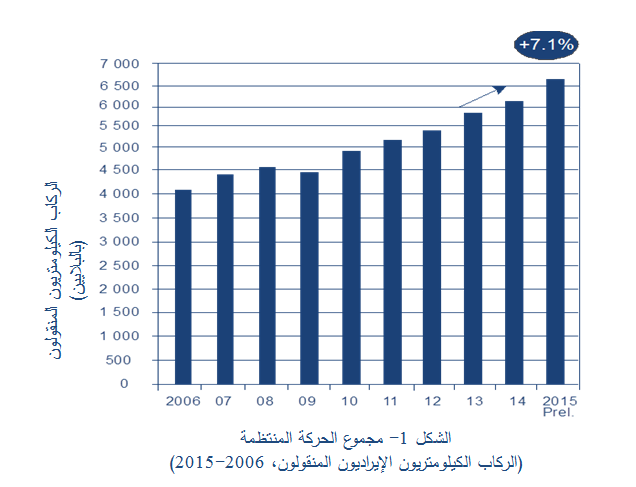 أما حركة الركاب، التي يتم التعبير عنها بمقياس الركاب الكيلومتريين الإيراديين (RPKs) ضمن مجموع الخدمات المنتظمة، فقد سجلت ارتفاعاً بنسبة 7.1 في المائة، إذ بلغ العدد وفقاً لهذا المقياس ما يقارب 601 6 مليار راكب كيلومتري إيرادي في عام 2015. وظل إقليم آسيا والمحيط الهادئ أكثر الأقاليم نشاطاً في حركة الركاب، إذ مثل 32 في المائة من الحركة العالمية، وسجل بذلك نمواً بنسبة 9.2 في المائة خلال عام 2015، تلته بعد ذلك أوروبا التي مثلت 27 في المائة من الحركة العالمية وحققت نمواً بنسبة 5.8 في المائة. أما أمريكا الشمالية، التي تمثل 25 في المائة من الحركة العالمية، فقد حققت نمواً بنسبة 5.1 في المائة. وسجل إقليم الشرق الأوسط نمواً بنسبة 10.3 في المائة، علماً بأنه يمثل 9 في المائة من الحركة العالمية. ومثل إقليم أمريكا اللاتينية والكاريبي 5 في المائة من الحركة العالمية محققاً نمواً بنسبة 7.8 في المائة. واضطلعت شركات الطيران المنتمية إلى إقليم أفريقيا بما تبقى من الحركة العالمية التي تمثل نسبة 2 في المائة، حيث حققت نمواً بنسبة 2.4 في المائة.