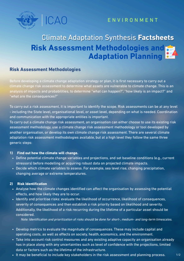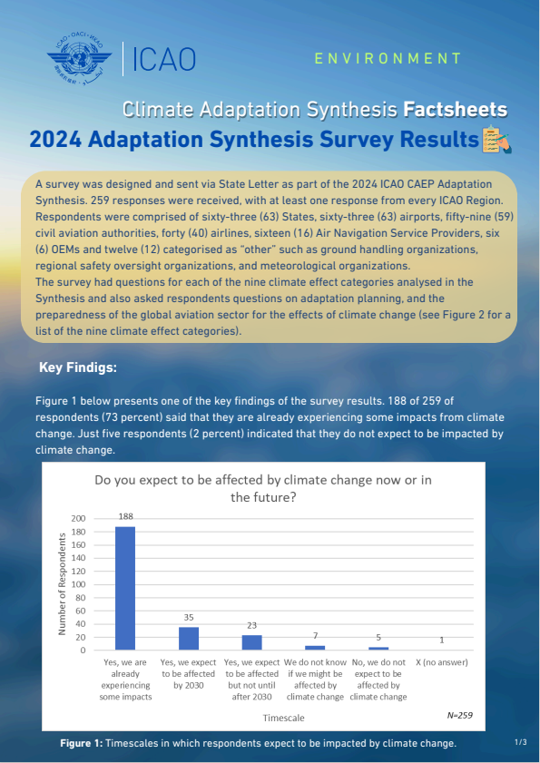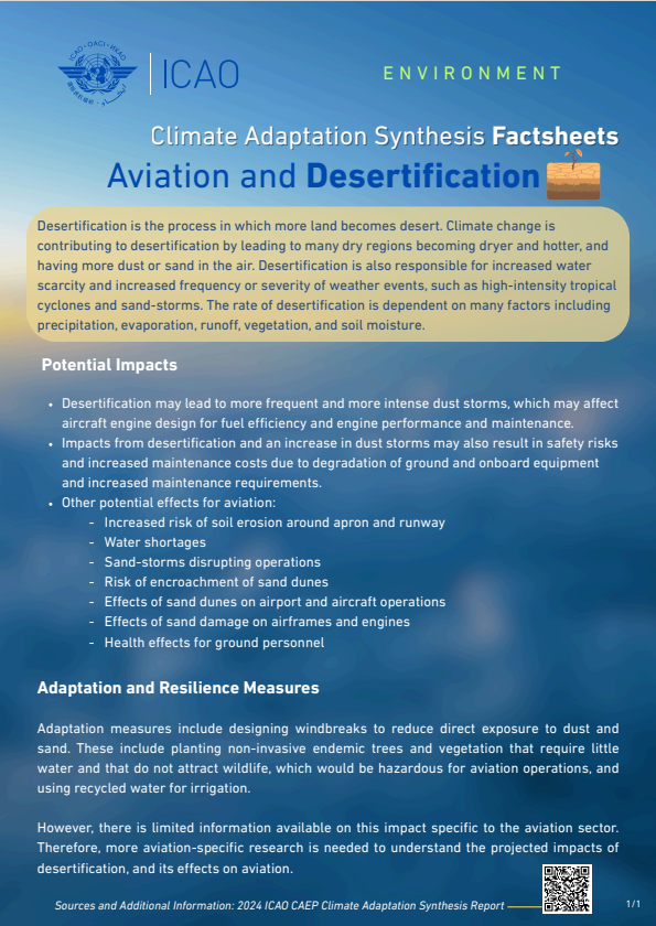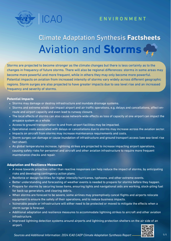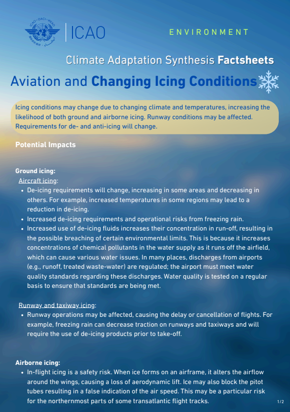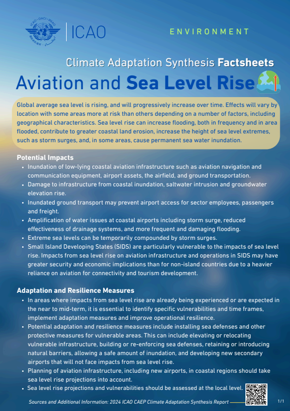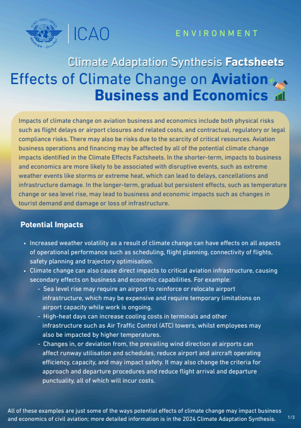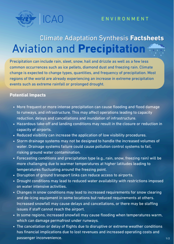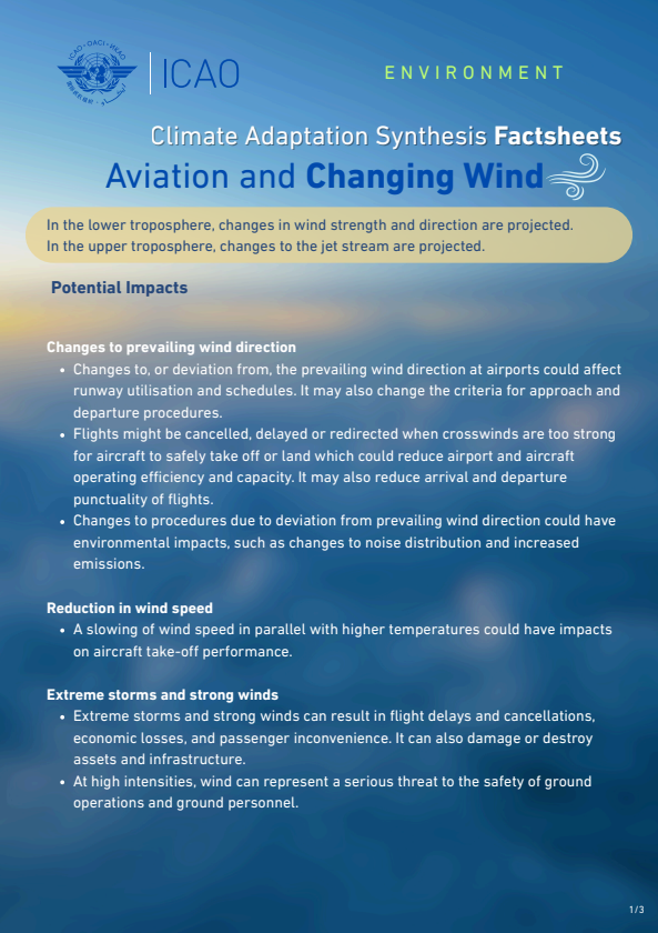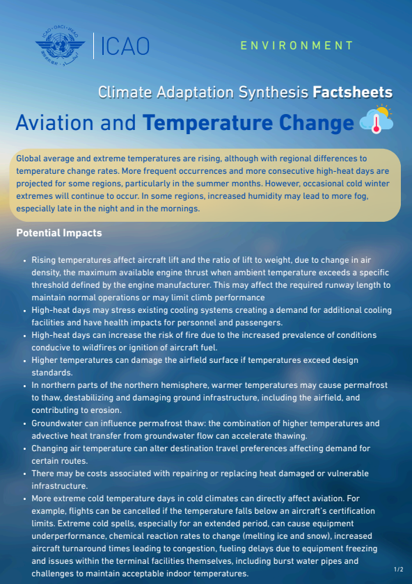 To support practical action, ICAO has developed a series of fact sheets summarizing key climate effects, impacts, and adaptation strategies. These fact sheets are designed to be used by airport operators, regulators, airlines, and other aviation stakeholders.