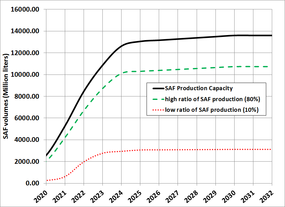 Figure 2 shows that up to 10.9 Mt (13.6 billion litres) per year of SAF production capacity may be available by 2032. However, there is significant uncertainty on the share of this capacity that will be directed to SAF compared to other fuels. The deployment scenarios shown in Figure 2 ("high ratio" and "low ratio") intend to highlight that uncertainty.