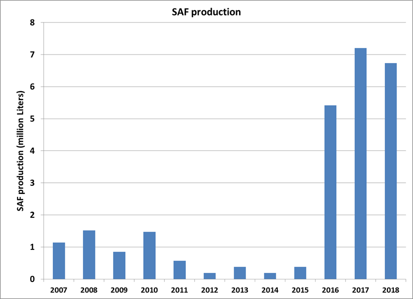 Figure 1 shows that commercial production of SAF increased from an average of 0.29 million litres per year (2013-2015) to 6.45 million litres per year (2016-2018).