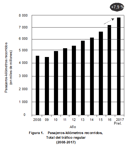 Según las estadísticas mundiales anuales compiladas preliminarmente por la OACI, la cantidad total de pasajeros transportados en servicios regulares aumentó a 4 100 millones en 2017, lo que equivale a un incremento del 7,2% respecto del año anterior, mientras que la cantidad de salidas alcanzó la cifra de