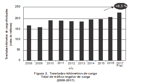 En 2017 se transportaron aproximadamente 56 millones de toneladas de carga. El crecimiento del tráfico total regular de carga, expresado en total de toneladas-kilómetros de carga (FTK) regular, fue del 9,5% en 2017, muy superior al 3,6% registrado en 2016. Este crecimiento obedeció principalmente a la mejora de la actividad comercial en 2017.