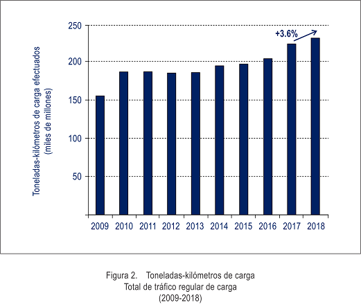 | Crecimiento del total de tráfico regular de carga, expresado en términos del total de toneladas-kilómetros de carga (FTK) regulares realizados: 3,6% |