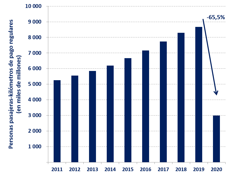 Según la recopilación preliminar que ha realizado la OACI de estadísticas mundiales anuales, el número total de personas trasportadas en servicios regulares disminuyó a 1 800 millones en 2020, es decir, un 60,1 % menos que el año anterior, habiéndose reducido el número de salidas a 20,3 millones en 2020, es decir, un