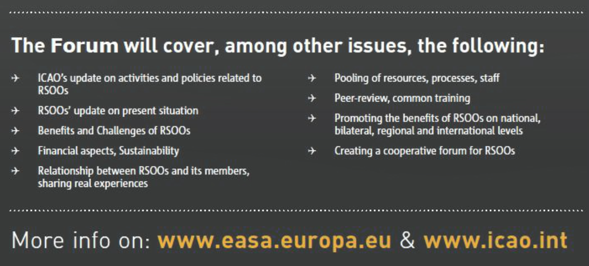 The RSOO Forum is a global event organized by EASA and ICAO in cooperation and hosted by the Republic of Swaziland. The full title of the Forum is “Regional Safety Oversight Organizations for Global Safety” and it sets out to be the springboard for the next generation of enhanced regional cooperation and recognition in the ICAO framework.