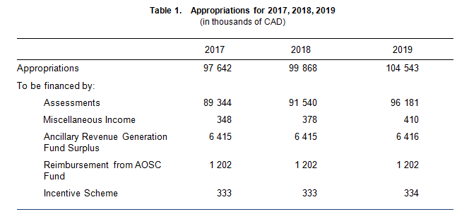The budget appropriations for 2017-2018-2019 and the financing of the appropriations, as approved by the Assembly, are shown in Table 1: