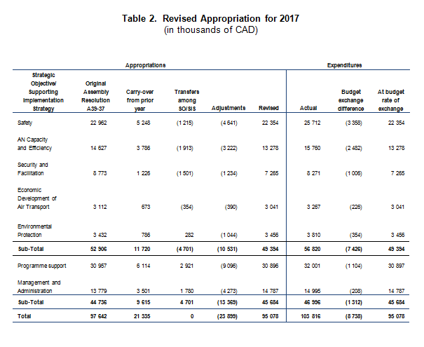 The actual expenditure for 2017 amounted to CAD 103 816 000. Since 2010, Member States are invoiced partly in USD and partly in CAD. The USD/CAD exchange rate on 1 January 2017 (the date when invoices were raised in USD) was higher than the rate used in developing the 2017 budget, causing an addition to total assessed contributions of CAD 11 386 000 of which CAD 1 658 000 pertains to outstanding 2017 assessments in USD. In addition, there was a revaluation of balance sheet items due to a net currency exchange loss of CAD 990 000. The net gain (CAD 8 738 000) has been allocated to actual expenditures (CAD 103 816 000) in order to restate them to the budget rate of exchange, which amounts to CAD 95 078 000.
