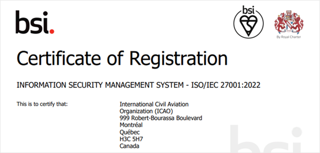 En juin 2025, l’OACI a obtenu avec succès la certification conforme à la norme ISO/CEI 27001: 2022, référence internationale en matière de systèmes de management de la sécurité de l'information (SMSI).