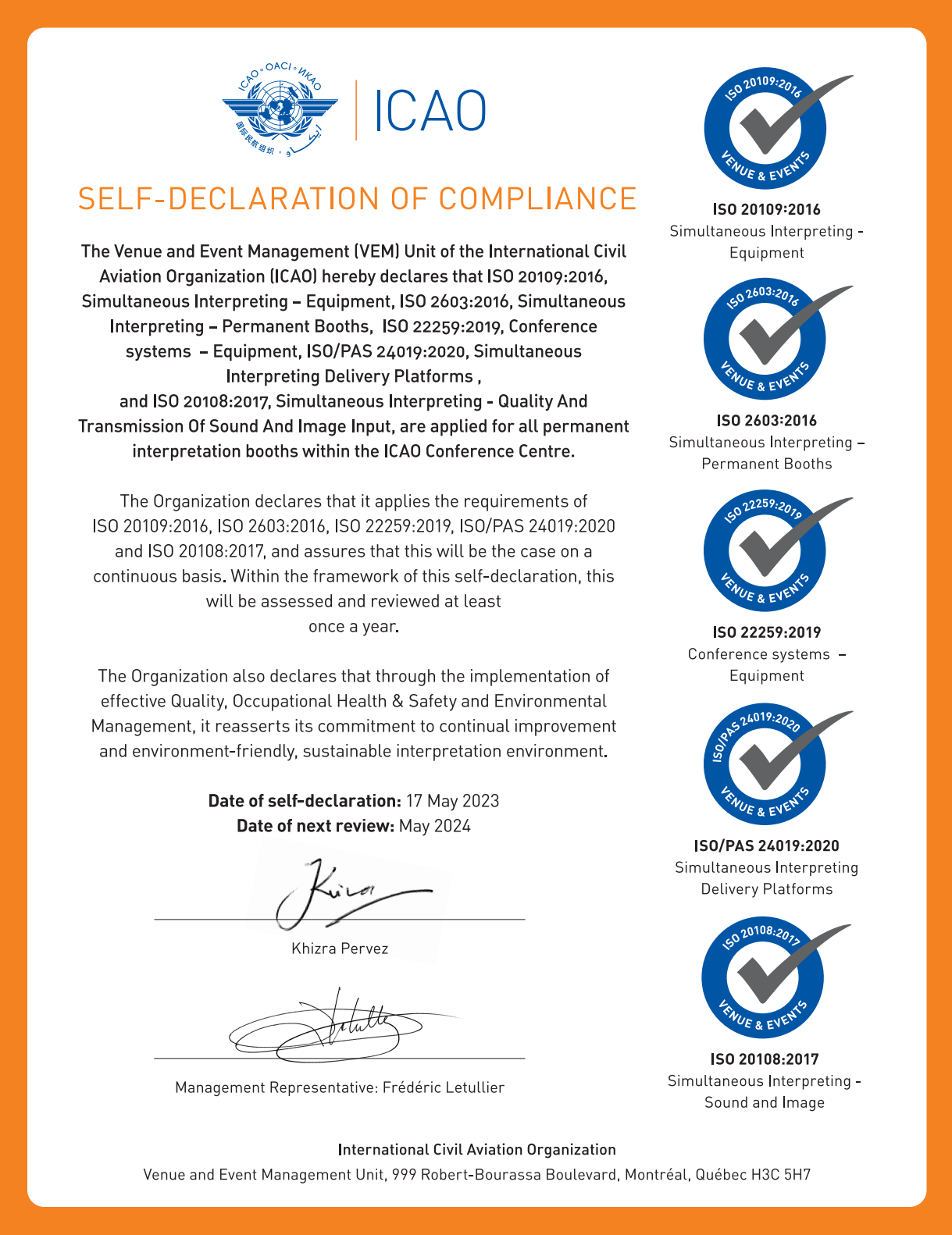 La Direction des services linguistiques, des publications et de la gestion des conférences est chargée de fournir efficacement et en temps voulu des services linguistiques et des services de publication dans les six langues officielles de l’Organisation des Nations Unies et de l’Organisation de l’aviation civile internationale (anglais, arabe, chinois, espagnol, français et russe), conformément aux normes de qualité requises, et de fournir des services de gestion des conférences et autres manifestations conformément aux normes ISO 9001:2015, ISO 14001:2015, ISO 45001:2018, ISO 20109:2016, ISO 2603:2016, ISO 22259:2019, ISO/PAS 24019:2020, et ISO 20108:2017.