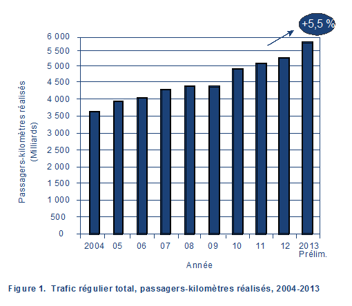 Le nombre total de départs sur les vols réguliers a légèrement augmenté de 1,2 % par rapport à 2012. Cette faible augmentation du nombre de vols par rapport à la croissance du trafic, combinée à l’amélioration des coefficients de remplissage des passagers, traduit une gestion plus efficace des compagnies aériennes.