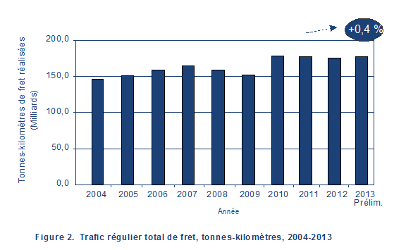 Le trafic de fret aérien, exprimé en tonnes-kilomètres de fret réalisées, a affiché une augmentation de 0,4 %, avec approximativement 49,3 millions de tonnes de fret transportées en 2013. Les transporteurs du Moyen-Orient ont affiché des taux de croissance globale à deux chiffres. La croissance a été de 4 % dans le cas de l’Afrique, et de 2,7 % dans celui de l’Amérique latine/Caraïbes. L’Asie/Pacifique et l’Europe sont demeurés presque stables, avec une croissance de 0,2 % et de −0,1 %, respectivement. L’Amérique du Nord a enregistré une baisse de 4,9 % par rapport à 2012.