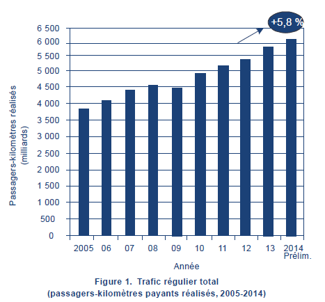 La croissance de 5,8 % du trafic passagers en services réguliers observée en 2014, comparativement à l’augmentation de 5,5 % enregistrée en 2013, doit être considérée dans le contexte des estimations de la Banque mondiale qui indiquent une légère amélioration du produit intérieur brut (PIB) de 2,6 % par rapport à 2,5 % en 2013. En 2014, la situation économique s’est améliorée dans les pays européens à hauts revenus et aux États-Unis, entraînant une hausse de la croissance du trafic dans ces États. Le trafic international a également poursuivi sa forte progression dans les Émirats arabes unis et en Chine, tandis qu’une forte croissance a été enregistrée dans le marché intérieur de la Fédération de Russie et de l’Inde. Tous ces éléments positifs compensent l’effet négatif qu’ont eu sur le trafic, en 2014, la faiblesse générale de l’économie dans les autres régions et le bas prix des produits.