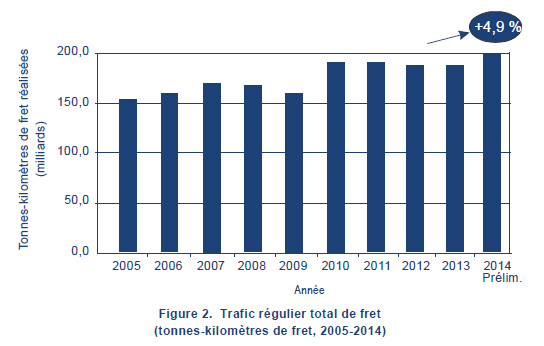 En 2014, la capacité offerte en service régulier international, exprimée en tonnes-kilomètres de fret disponibles, a été d’environ 330 milliards, ce qui représente une hausse de 5 % par rapport à 2013. Le coefficient de chargement pour ce qui est du transport de fret en service régulier international est demeuré le même qu’en 2013, soit 49,7 %.