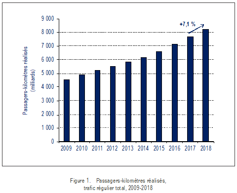 Selon des statistiques annuelles mondiales préliminaires compilées par l’OACI, le nombre total de passagers transportés sur des services réguliers en 2018 est passé à 4,3 milliards, ce qui représente une augmentation de 6,4 % par rapport à l’exercice précédent. Le nombre de départs a atteint 37,8 millions dans le monde en 2018, soit une hausse de 3,5 % par rapport à 2017. Des statistiques détaillées sur le transport aérien figurent à la page Présentation des résultats statistiques du transport aérien en 2018.