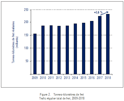 En 2018, la capacité offerte en service régulier international, exprimée en tonnes-kilomètres de fret disponibles, a été d’environ 363 milliards, ce qui représente une hausse de 3,4 % par rapport à 2017. Le coefficient de chargement pour ce qui est du transport de fret en service régulier international est resté le même à 55 %.