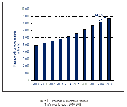 Selon des statistiques annuelles mondiales préliminaires compilées par l’OACI, le nombre total de passagers transportés sur des services réguliers en 2019 est passé à 4,5 milliards, ce qui représente une augmentation de 3,6 % par rapport à l’exercice précédent. Le nombre de départs a atteint 38,3 millions en 2019, soit une hausse de 1,7 % par rapport à 2018. Des statistiques détaillées sur le transport aérien figurent à la page Présentation des résultats statistiques du transport aérien en 2019.