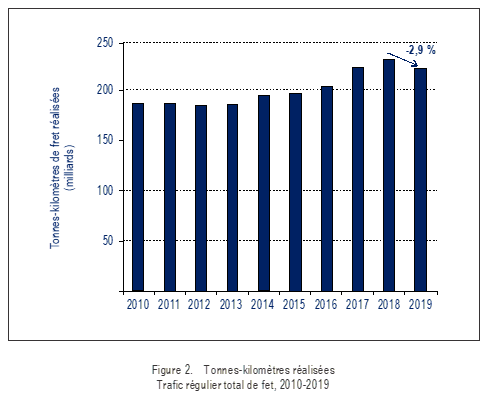 | Diminution du trafic total de fret régulier, exprimé en termes de tonnes-kilomètres de fret régulier réalisées (FTK) : -2,9 % |