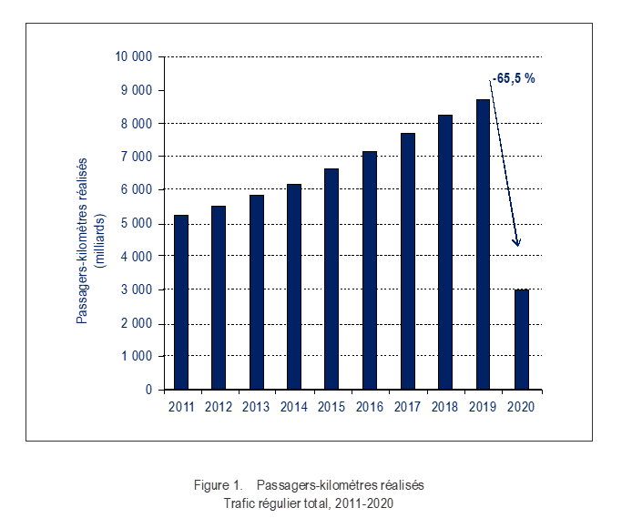 Selon des statistiques annuelles mondiales préliminaires compilées par l’OACI, le nombre total de passagers transportés sur des services réguliers en 2020 a diminué pour s’établir à 1,8 milliard en 2020, ce qui représente une baisse de 60,1 % par rapport à l’exercice précédent. Le nombre de départs s’est établi à 20,3 millions en 2020, soit une baisse de 47,1 %. Des statistiques détaillées sur le transport aérien figurent à la page Présentation des résultats statistiques du transport aérien en 2020.