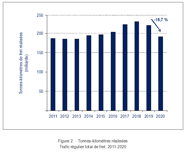En 2020, la capacité offerte en service régulier international, exprimée en tonnes-kilomètres de fret disponibles, a été d’environ 280 milliards, ce qui représente une baisse de 25,9 % par rapport à 2019. Le coefficient de chargement pour ce qui est du transport de fret en service régulier international a augmenté pour atteindre