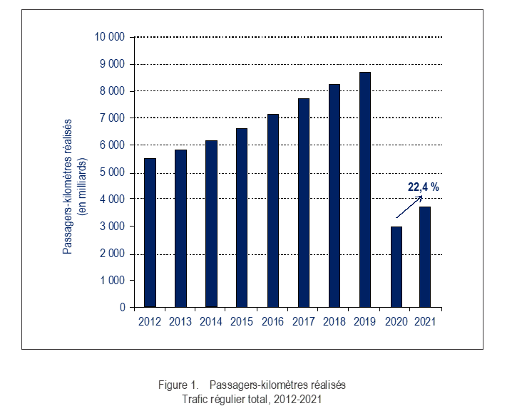 Selon des statistiques annuelles mondiales préliminaires compilées par l’OACI, le nombre total de passagers transportés sur des services réguliers en 2021 a augmenté pour s’établir à 2,3 milliards en 2021, ce qui représente une hausse de 28,1 % par rapport à l’exercice précédent. Le nombre de départs s’est établi à 24,2 millions en 2021, soit une hausse de 19,2 %. Des statistiques détaillées sur le transport aérien figurent à la page Présentation des résultats statistiques du transport aérien en 2021.