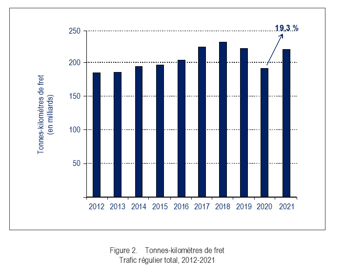 En 2021, la capacité offerte en service régulier international, exprimée en tonnes-kilomètres de fret disponibles, a été d’environ 308 milliards, ce qui représente une hausse de 10,0 % par rapport à 2020. Le coefficient de chargement pour ce qui est du transport de fret en service régulier international a augmenté pour atteindre 65,1 %.