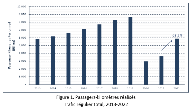 Selon des statistiques annuelles mondiales préliminaires compilées par l’OACI, le nombre total de passagers transportés sur des services réguliers en 2022 a augmenté pour s’établir à 3,3 milliards en 2022, ce qui représente une hausse de 42,8 % par rapport à l’exercice précédent. Le nombre de départs s’est établi à 29,8 millions en 2022, soit une hausse de 23,1 %. Des statistiques détaillées sur le transport aérien figurent à la page Présentation des résultats statistiques du transport aérien en 2022.