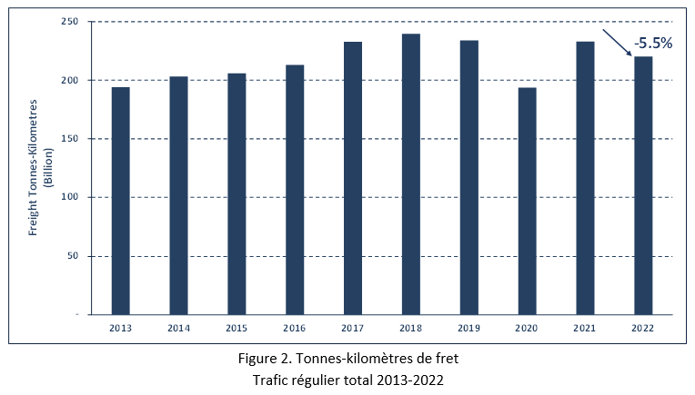 En 2022, la capacité offerte en service régulier international, exprimée en tonnes-kilomètres de fret disponibles, a été d’environ 359 milliards, ce qui représente une hausse de 13,1 % par rapport à 2021. Le coefficient de chargement pour ce qui est du transport de fret en service régulier international a diminué en 2022 pour passer à 53,9 %.