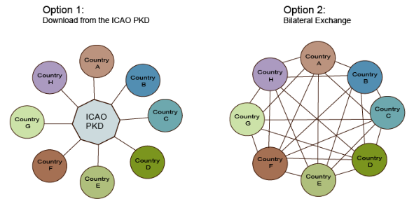 As demonstrated in the simple graphic below, downloading certificates from the ICAO PKD is more efficient than bilateral exchange.