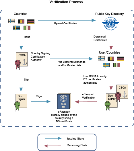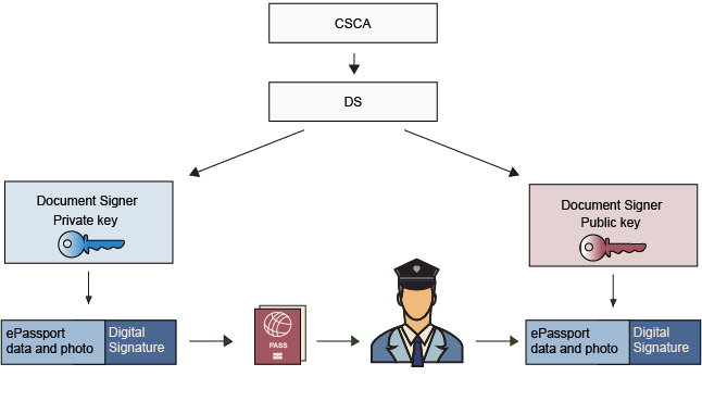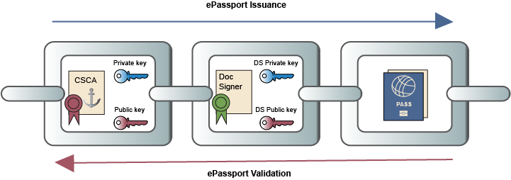 A digital signature on an ePassport is derived from the issuing State’s security certificates, each of which contains the public key that can be used to verify its authenticity—the Country Signing Certification Authority (CSCA) Certificate and the Document Signer Certificate (DSC). Together, the signature and certificates form a trust chain wherein one end is securely anchored in the authority of the issuing State and the other end is securely stored in the chip of the ePassport as the Document Security Object. The Document signer must be validated against the CSCA to validate the digital signature to complete the whole chain of trust regarding the signatures.