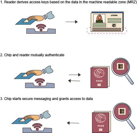 It is important to note that the process of validating an ePassport does not contribute to protecting the privacy of the information on the chip. To protect the privacy of the travel document holder, data on the chips of ePassports are generally protected by an access control mechanism. In basic terms, the access control mechanism denies access to the chip contents unless the inspection system can prove that it is authorized to access the chip. This “proof of authorization” is acquired by reading information found on the datapage of the ePassport booklet. The assumption is that if the traveller has willingly handed their ePassport over for somebody to open and read, the traveller has authorized that person to see that information as well as the information stored on the chip. These access control mechanisms prevent skimming of the chip data and eavesdropping of the communications between an ePassport and the inspection system.
