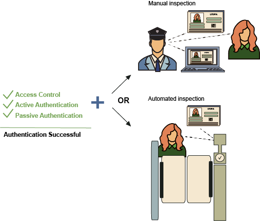 This result should be displayed when all verifications linked to the “e” part of the presented ePassport were successful. Passive authentication has confirmed that the data stored on the chip is genuine and has not been tampered with, and if supported by the chip, another process has confirmed that the chip is not a clone. To complete the authentication, the data displayed on the screen of the inspection system (i.e. populated from the data stored on the chip) should be compared against the physical document. This comparison can be conducted manually by a border officer or by an automated system.