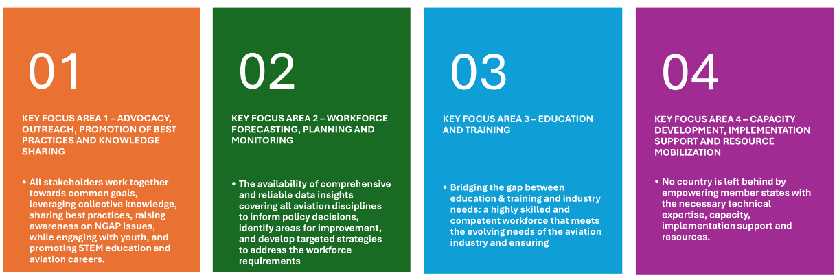 To support these efforts, the ICAO NGAP strategy—articulated through its Vision, Mission, Objectives, and Key Focus Areas—provides a global framework for aviation workforce development. This strategy helps guide the creation of workforce plans at international, regional, and national levels, while bringing together all aviation stakeholders to address current and future human capital challenges in the industry.