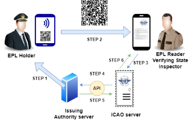Scanning an EPL QR code enables a self-contained mobile electronic visual display device to interrogate a Licensing Authority database with the EPL information contained in the QR code (Issuing Authority, licence number) via the ICAO server.