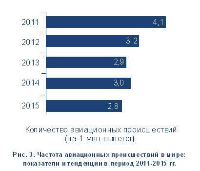 В области безопасности полетов в 2015 году при осуществлении регулярных воздушных перевозок произошло 92 авиационных происшествия, что составляет снижение на 5 % по сравнению с 2014 годом, в котором произошло 97 авиационных происшествий. Анализ проводился на основе данных по безопасности полетов в мире применительно к коммерческим воздушным судам, имеющим максимальную разрешенную взлетную массу более 5700 кг. Количество погибших на регулярных рейсах в мире снизилось до 474 по сравнению с 904 в 2014 году. Количество авиационных происшествий со смертельным исходом также сократилось с семи в 2014 году до всего лишь шести. Количество авиационных происшествий в мире снизилось до 2,8 на 1 млн регулярных рейсов по сравнению с 3 на 1 млн регулярных рейсов в 2014 году.
