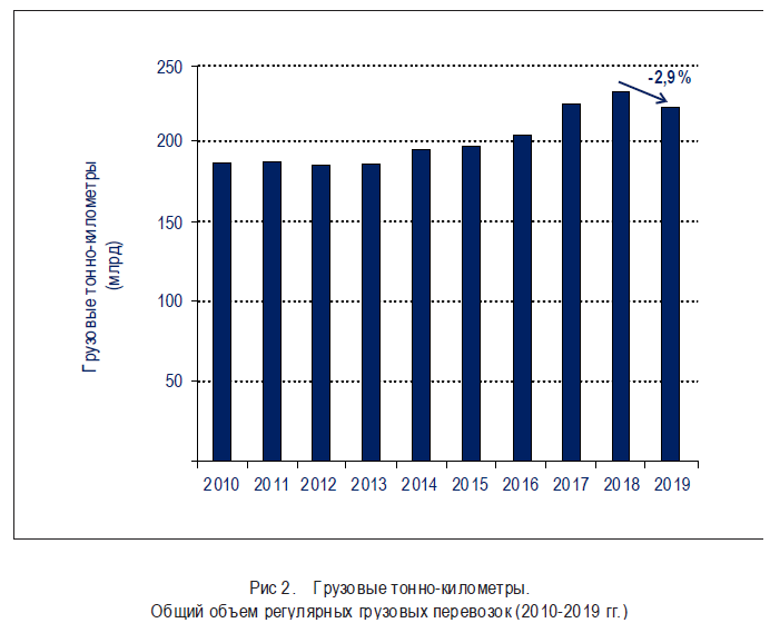 | Сокращение общего объема регулярных грузовых перевозок в целом, выраженного в виде общего количества выполненных грузовых тонно-километров (ГТК) при регулярных перевозках: -2,9 % |