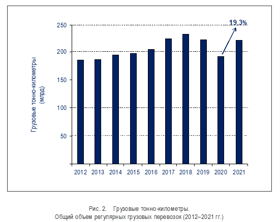 Рост общего объема регулярных грузовых перевозок в целом, выраженного в виде общего количества выполненных грузовых тонно-километров (ГТК) при регулярных перевозках: 20,1 %