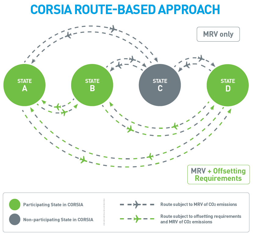 The term “participation of States to CORSIA offsetting” means that if a State participates in CORSIA offsetting, then all routes between this State and all other States participating in CORSIA offsetting are covered by offsetting requirements.
