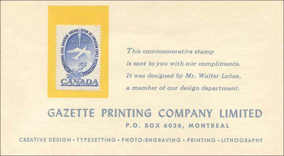 On the initiative of Mr. Karl E. Lohse, the Chief of ICAO's Aeronautical Charts Section, his brother Walter Lohse, Art Director of the Gazette Printing Company Limited in Montréal, reworked the draft and completed the design for the final issue. Born in Liège, Belgium in January 1897, Walter Lohse began his career as a civil engineer, but discovered later that he was a better artist than an engineer. He came to Canada in 1930 and joined in 1942, as Assistant Art Director, The Gazette, a large printing company in Montréal, Canada. The design of the stamp was submitted as a solution to reconcile several requirements that had proven difficult to blend harmoniously in the earlier stage of its development.