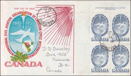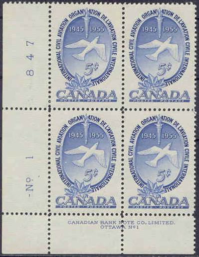 Canada – 1 June 195510th Anniversary of ICAO Lower-left block of 4 stamps with marginal inscriptions |